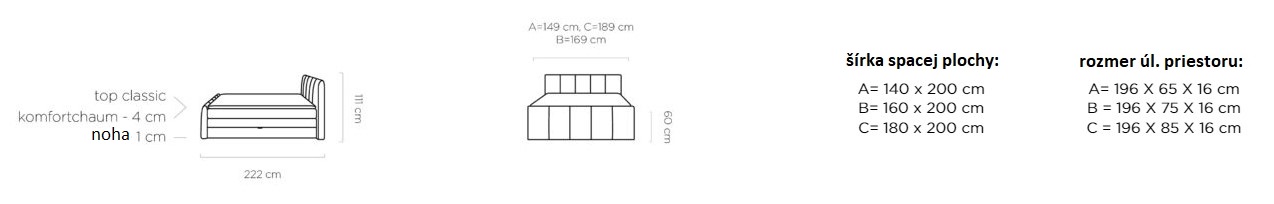Dostupná ve třech rozměrových šířkách: A-140x200 cm / B-160x200 cm / C-180x200 cm