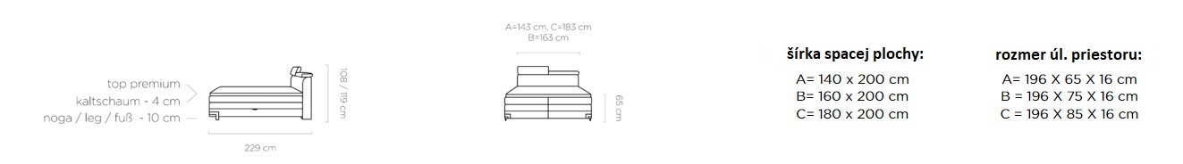 Dostupná ve třech rozměrových šířkách: A-140x200 cm / B-160x200 cm / C-180x200 cm