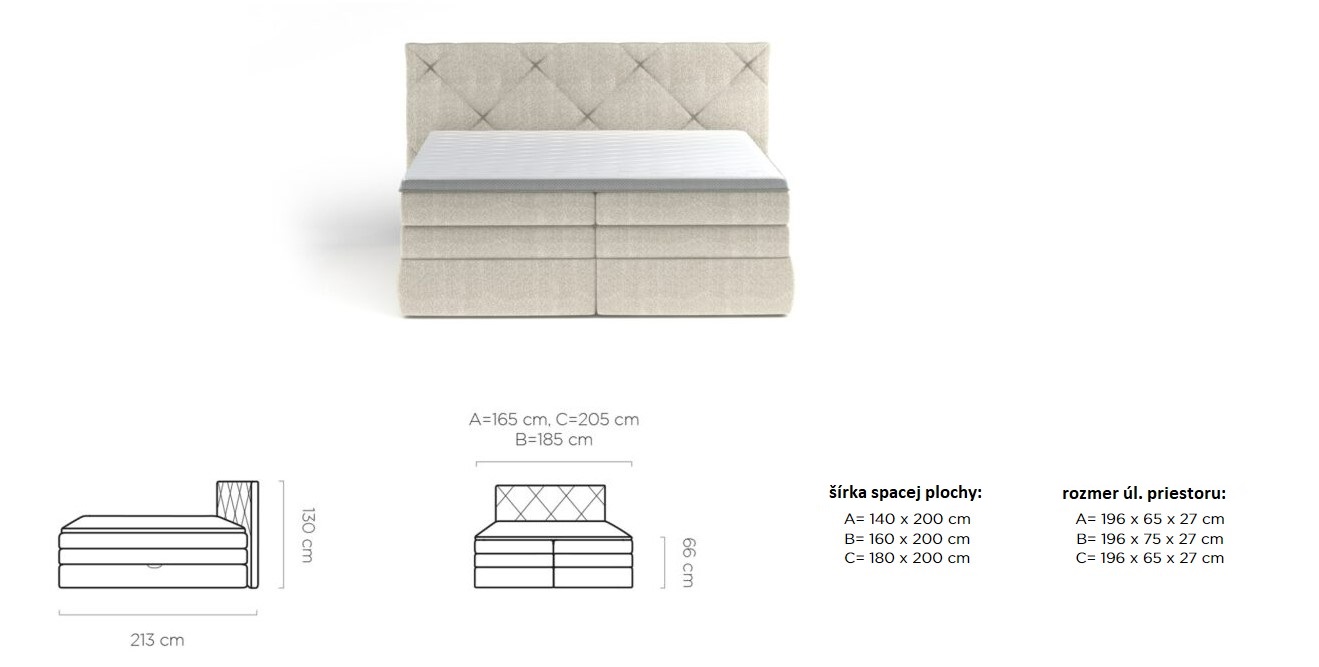 Dostupná ve třech rozměrových šířkách: A-140x200 cm / B-160x200 cm / C-180x200 cm