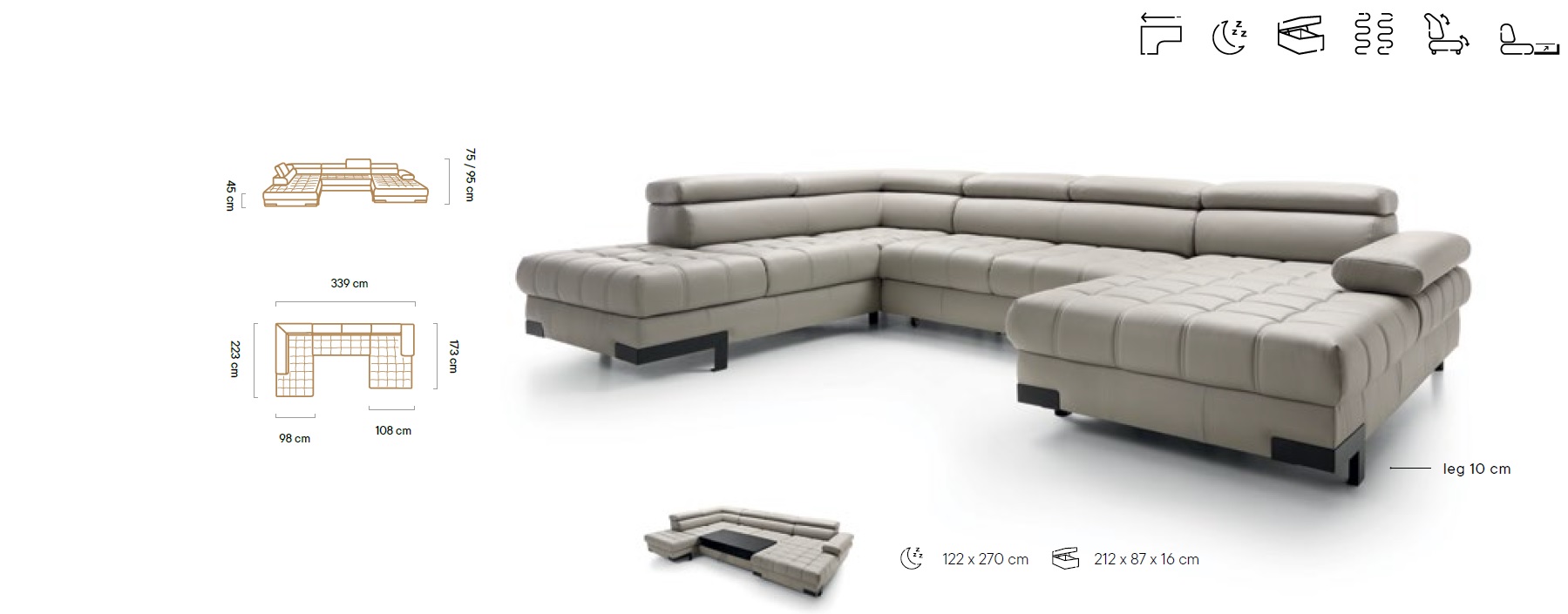 Rozměr: 173 x 339 x 223 cm, Spací plocha: 270 x 122 cm, Výška: 75 / 95 cm, Výška sedu: 45 cm