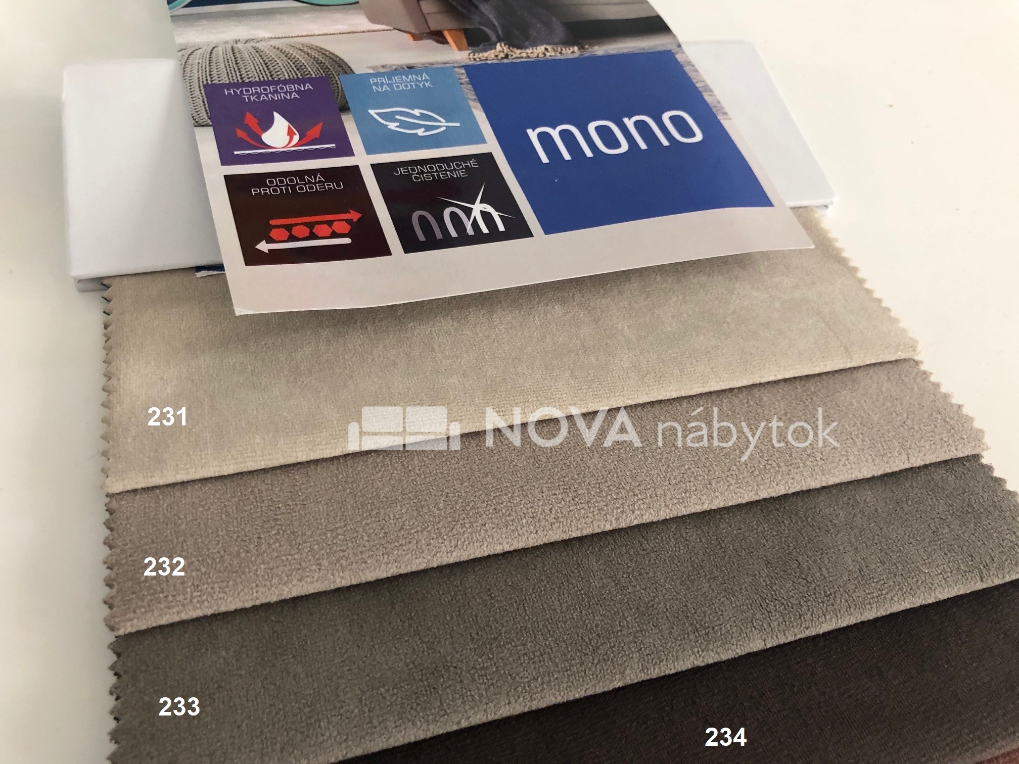 Látka MONO kombinuje luxusní vzhled sametu s vysokou odolností a praktičností. Je měkká, moderní a díky snadnému čištění vhodná i do domácností s dětmi nebo domácími mazlíčky.