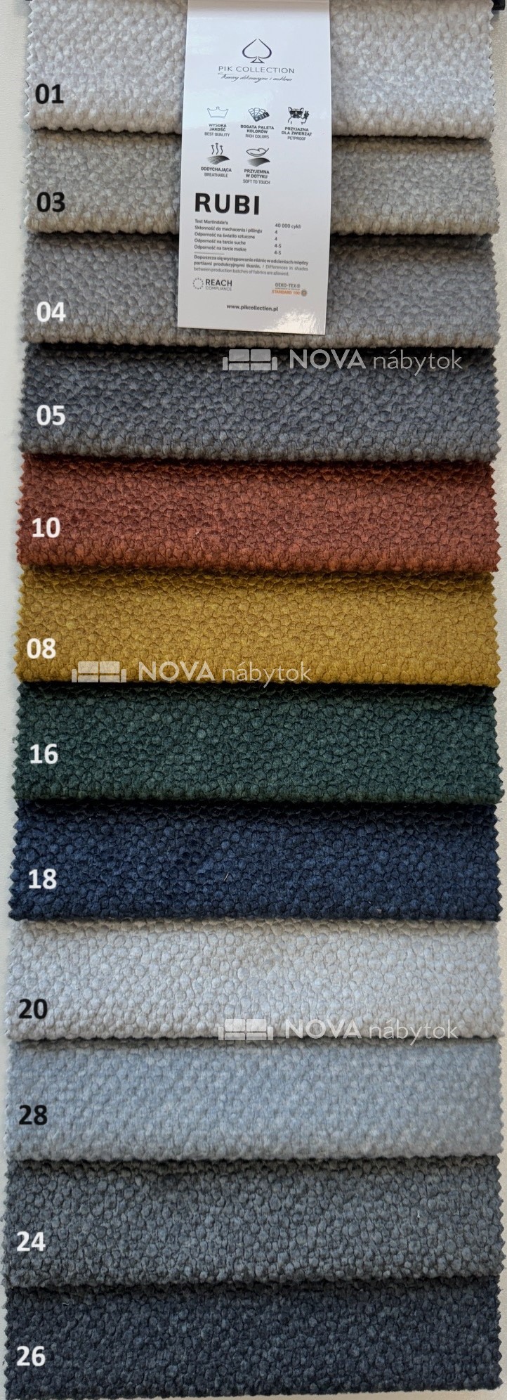 Rubi je mimořádně příjemná a kvalitní potahová látka s jemnou strukturou, která působí elegantně a nadčasově. Vysoká gramáž látky zajišťuje výbornou pevnost a komfort při každodenním používání. Vhodná je pro čalounění sedacích souprav, křesel, taburetů i dekorativních polštářů.