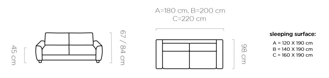 Rozměr: 220 x 98 cm, Spací plocha: 160 x 200 cm, Výška: 67 / 84 cm, Výška sedu: 45 cm