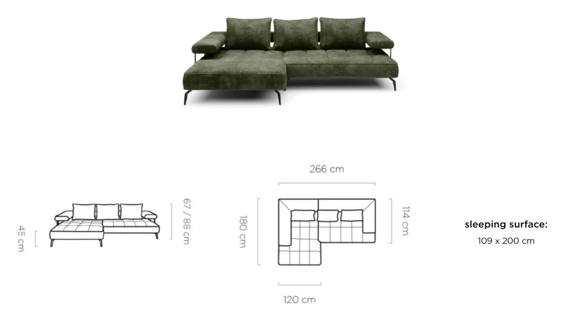 Rozměr: 266 x 180 cm, Výška: 67 / 88 cm, Výška sedu: 45 cm