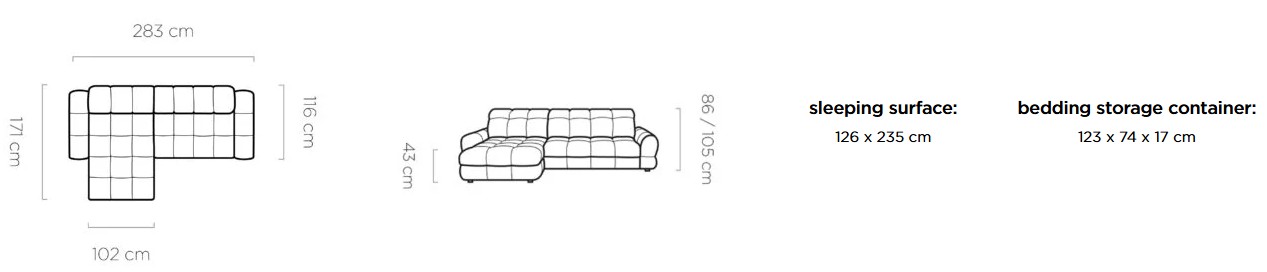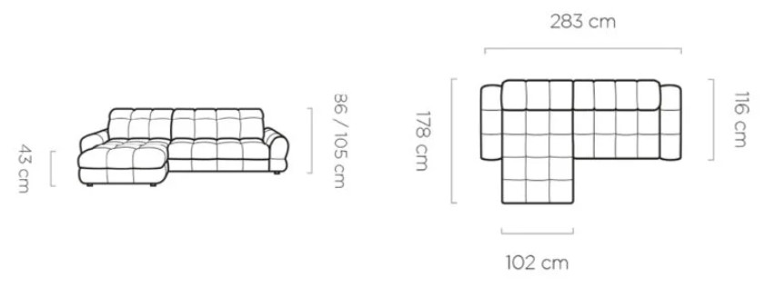 Rozměr: 283 x 178 cm, Výška: 86 / 105 cm, Výška sedu: 43 cm
