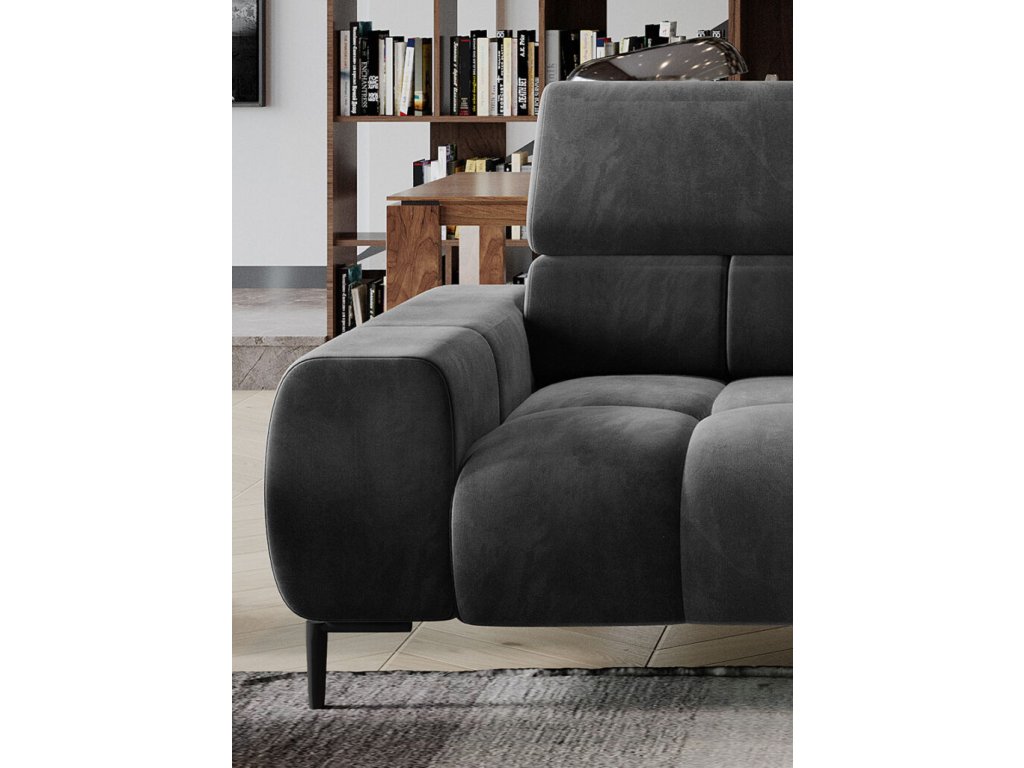 Na první pohled zaujme nadýchaná sedací část tvořená dekorativně prošívanými polštářky. Pohodlí doplňuje měkké opěradlo a polohovatelné opěrky hlavy, které umožňují individuální nastavení při sezení i relaxaci. Moderní vzhled podtrhují vysoké kovové nožky v černé barvě, které zároveň usnadňují úklid pod pohovkou.