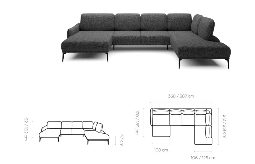 Rozměr: 170/189 × 367/387 × 212/231 cm, Výška: 92/102 cm, Výška sedu: 47 cm