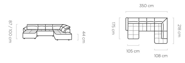 Rozměr: 175 × 350 × 218 cm, Výška: 87 / 100 cm, Výška sedu: 44 cm