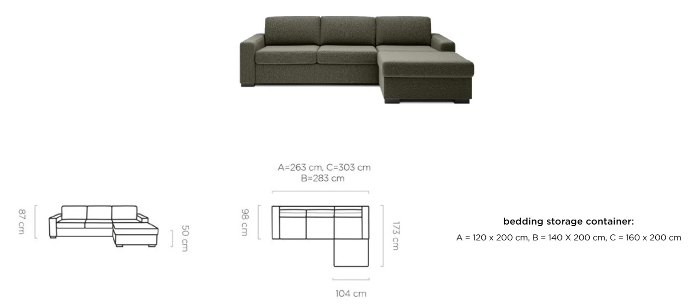 Rozměr: 303 x 173 cm, Spací plocha: 160 x 200 cm, Výška: 87 cm, Výška sedu: 50 cm