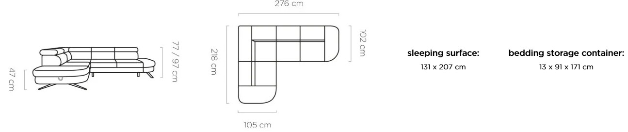 Rozměr: 276 x 218 cm, Výška: 77 / 97 cm, Výška sedu: 47 cm, Spací plocha: 131 x 207 cm