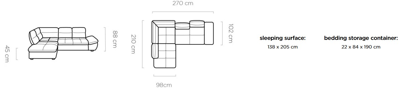Rozměr: 270 x 210 cm, Výška: 88 cm, Výška sedu: 45 cm, Spací plocha: 138 x 205 cm