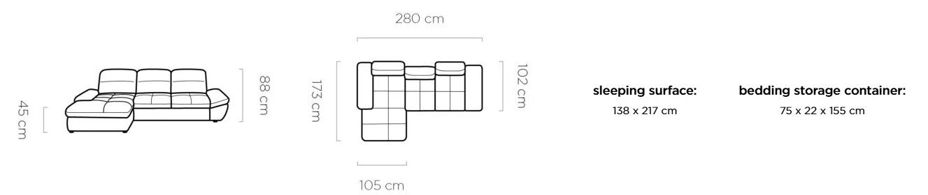 Rozměr: 280 x 173 cm, Výška: 88 cm, Výška sedu: 45 cm, Spací plocha: 138 x 217 cm