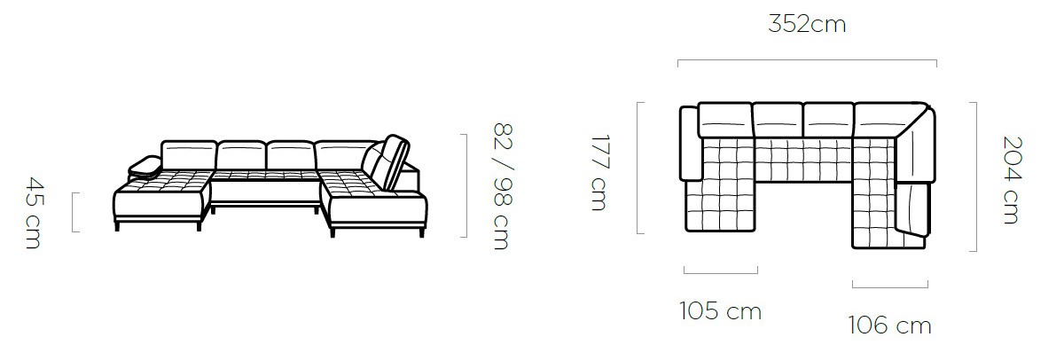 Rozměr: 204 x 352 x 177 cm, Výška: 82 / 98 cm, Výška sedu: 45 cm