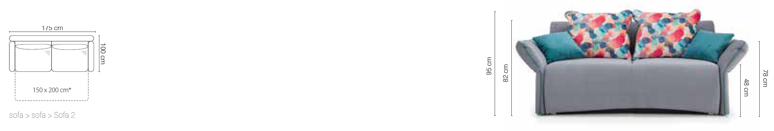 Rozměr: 175 × 100 cm, Výška: 95 cm, Výška sedu: 48 cm