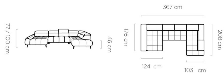 Rozměr: 176 x 367 x 208 cm, Výška: 77 / 100 cm, Výška sedu: 46 cm