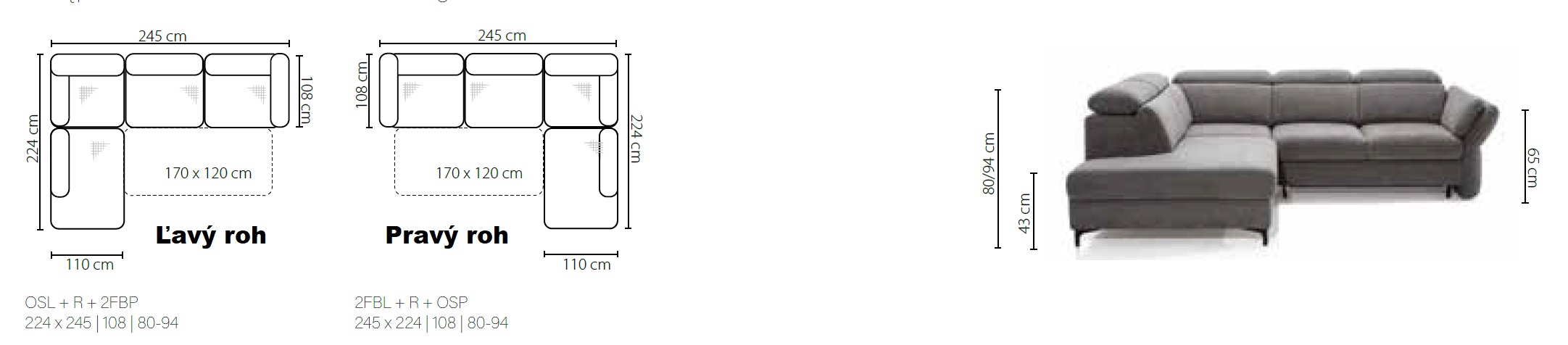 Rozměr: 245 × 224 cm, Spací plocha: 170 × 120 cm, Výška sedu: 43 cm, Celková výška: 80–94 cm