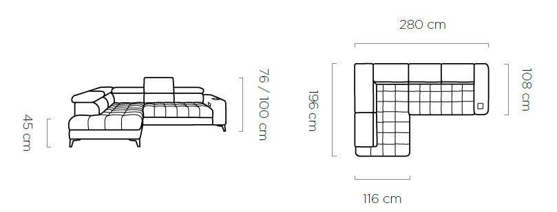 Rozměr: 280 x 196 cm, Výška: 76 / 100 cm, Výška sedu: 45 cm