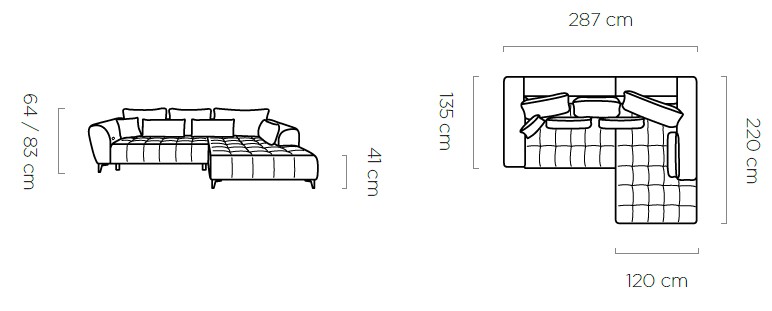 Rozměr: 287 x 220 cm, Výška: 64 / 83 cm, Výška sedu: 41 cm, Spací plocha: 126 x 228 cm
