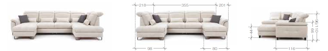 Rozměr: 218 × 355 × 201 cm, Výška: 96 / 110 cm, Výška sedu: 44 cm, Spací plocha: 275 × 146 cm