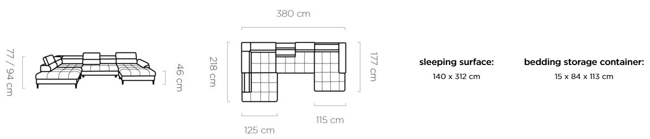 Rozměr: 218 x 380 x 177 cm, Výška: 77 / 94 cm, Výška sedu: 46 cm, Spací plocha: 140 x 220 cm