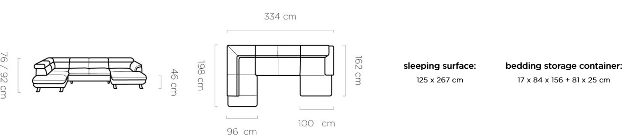 Rozměr: 198 x 334 x 162 cm, Výška: 76 / 92 cm, Výška sedu: 44 cm, Spací plocha: 125 x 267 cm