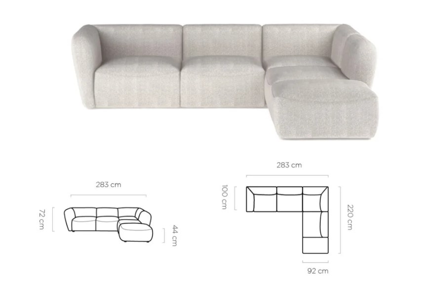 - Celková šířka sedací soupravy včetně opěradel: 283 cm