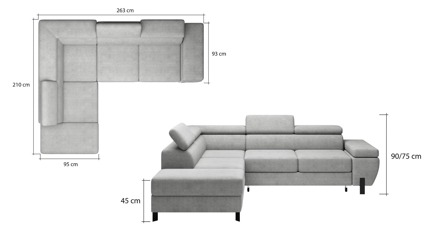 Rozměr: 263 x 210 cm, Spací plocha: 210 x 125 cm, Výška: 95 / 108 cm, Výška sedu: 45 cm