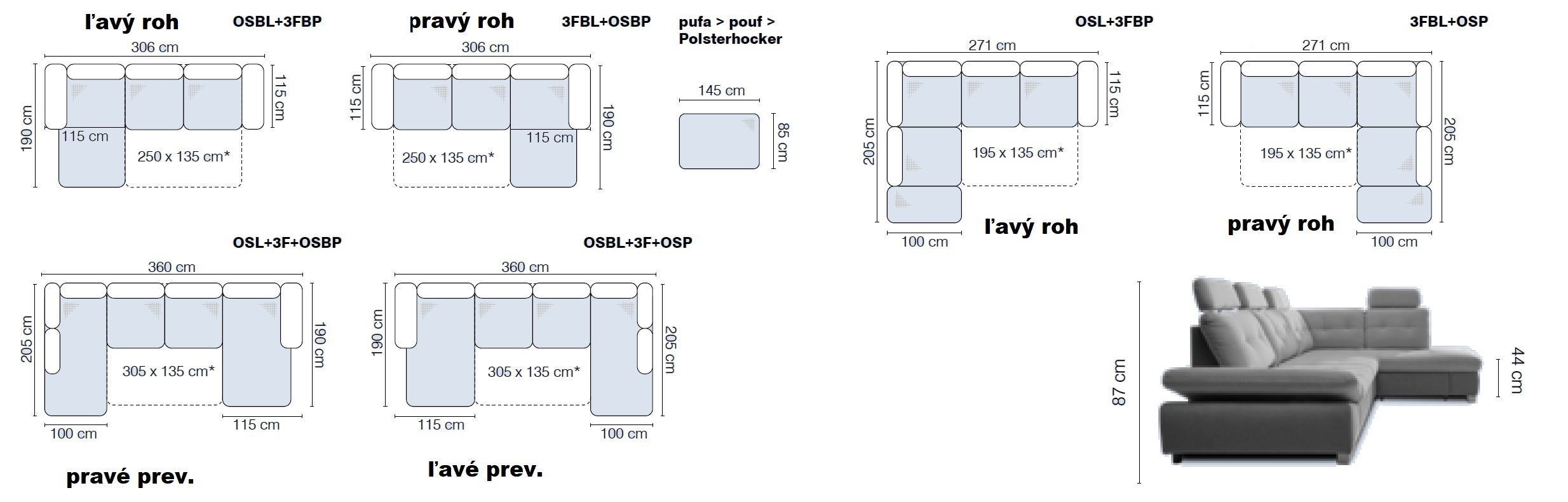 - Provedení sedací soupravy: Možnost výběru pravého/levého provedení