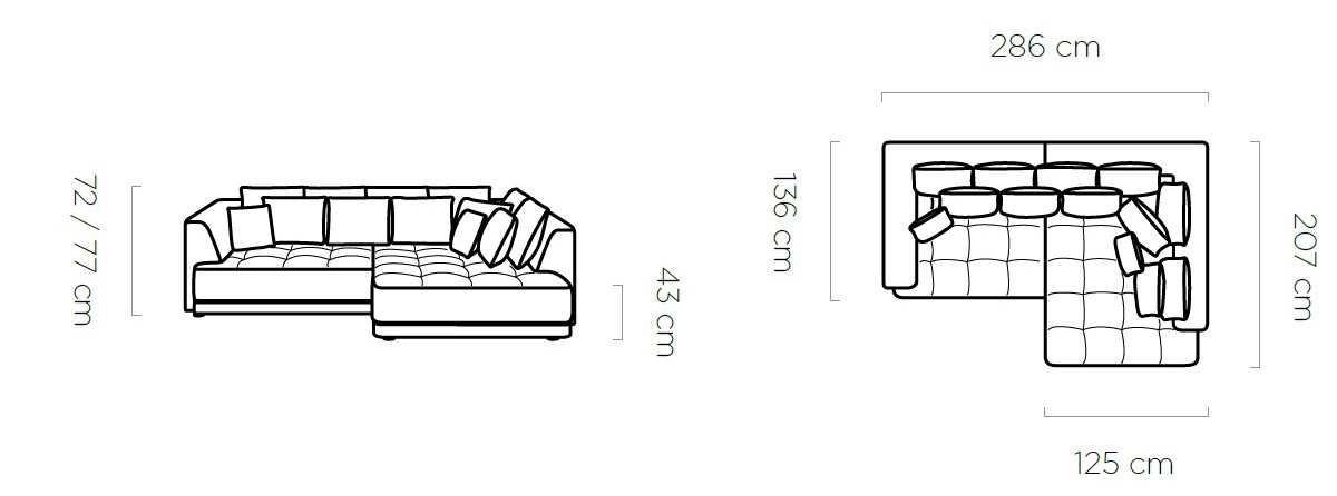 Rozměr: 286 x 207 cm, Spací plocha: 124 x 217 cm, Výška: 72 / 77 cm, Výška sedu: 43 cm