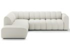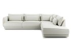 Rohová sedací souprava LUNA R4 (OBL + 1,5 + 1,5BP) ve světlém čalounění v moderním interiéru, pohled zešikma s kobercem a konferenčním stolkem.