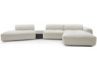 Pohovka LUNA SOFA 2 (1,5BL + PANEL + 1,5BP) ve světle krémovém provedení v obýváku, pohled zepředu se stolkem, lampou a dekou.