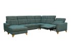 Rohová sedací souprava MARTINA v petrolejově zelené látce v obývacím pokoji s kobercem a dekoracemi, levé provedení, pohled zepředu.