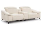 Třímístná pohovka MONZA sofa 3 ve světle růžovém potahu na bílém pozadí, čelní pohled na tři sedáky se širokými područkami a kovovými nožkami.