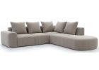 Rohová sedací souprava RESA velký roh ve světlém čalounění na bílém pozadí, čelní pohled s dekorací a lampou u sestavy.