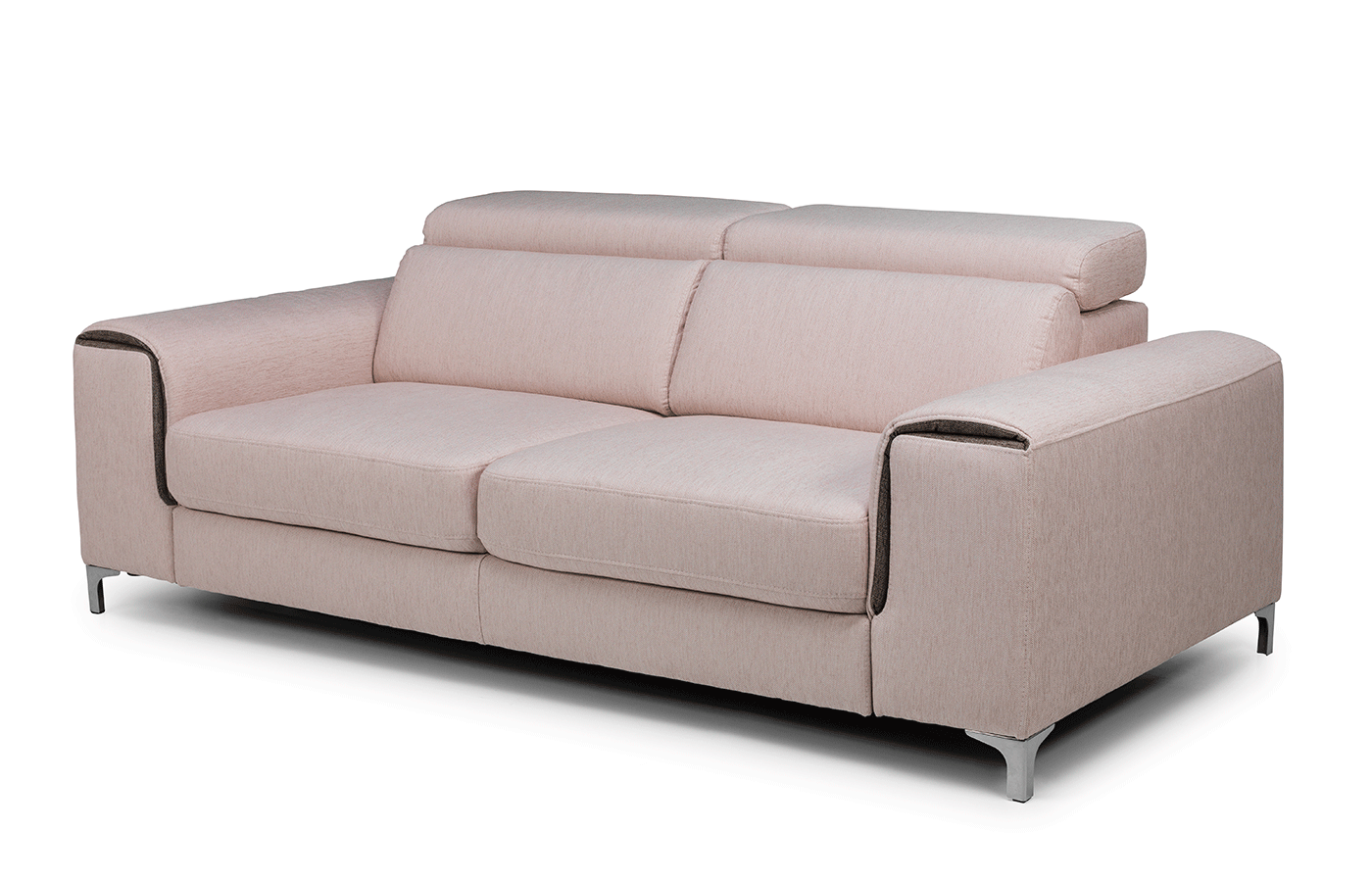 Opěradla jsou pevná a doplněná o polohovací opěrky hlavy. Pevné područky přímo vybízejí k maximálnímu pohodlí. Všimněte si také kontrastního detailu na područkách – drobnosti, která podtrhuje luxusní design. Celá pohovka je čalouněná, a proto se skvěle vyjímá i uprostřed místnosti.